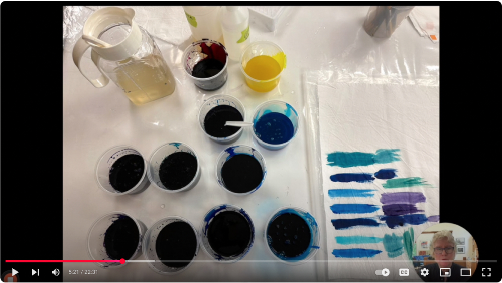 Mixing the thickened dye colors and testing on a cotton swatch before I paint.