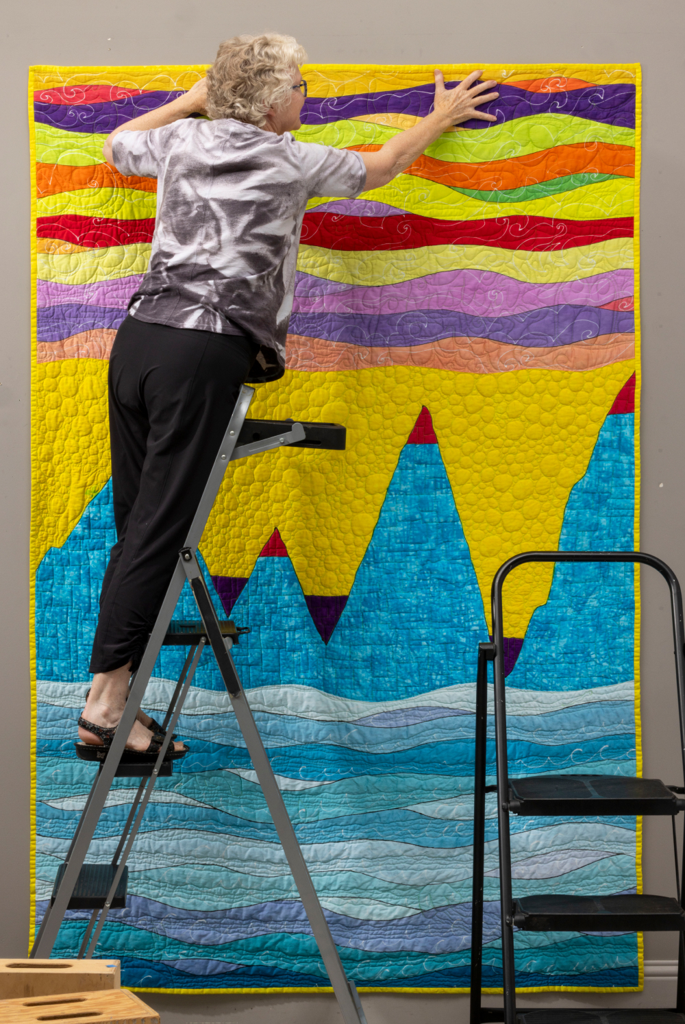 I have made our four grandchildren full-sized quilts for their beds for their 6-year birthdays, all inspired by their own ideas. Kai and I discussed what he wanted; he decided the upside down/right side up shapes of the mountains and the colors of the stripes in ocean and sky.