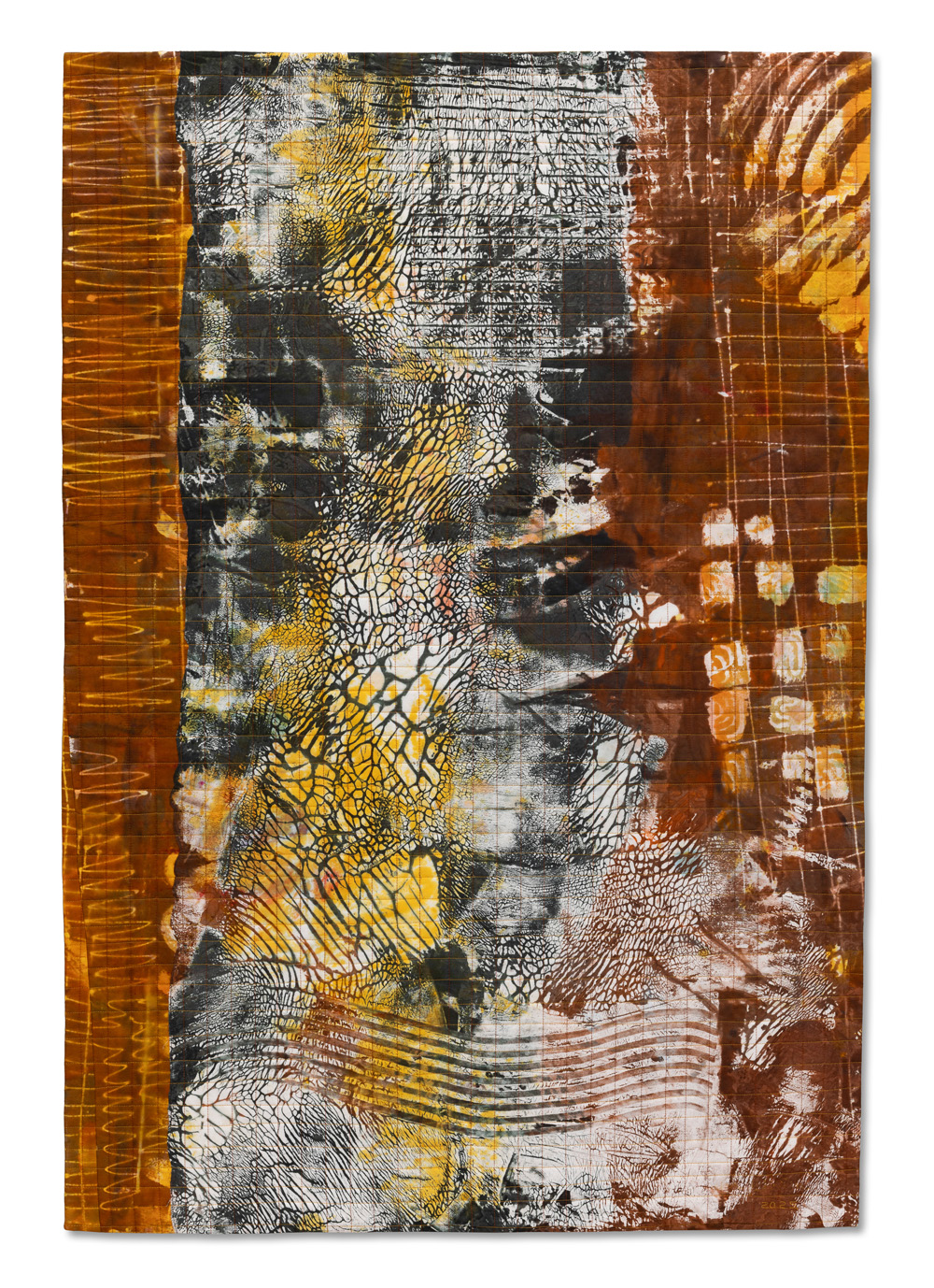 Printed and painted with thickened dye, corn and potato resist, raw edge machine applique, machine quilted.