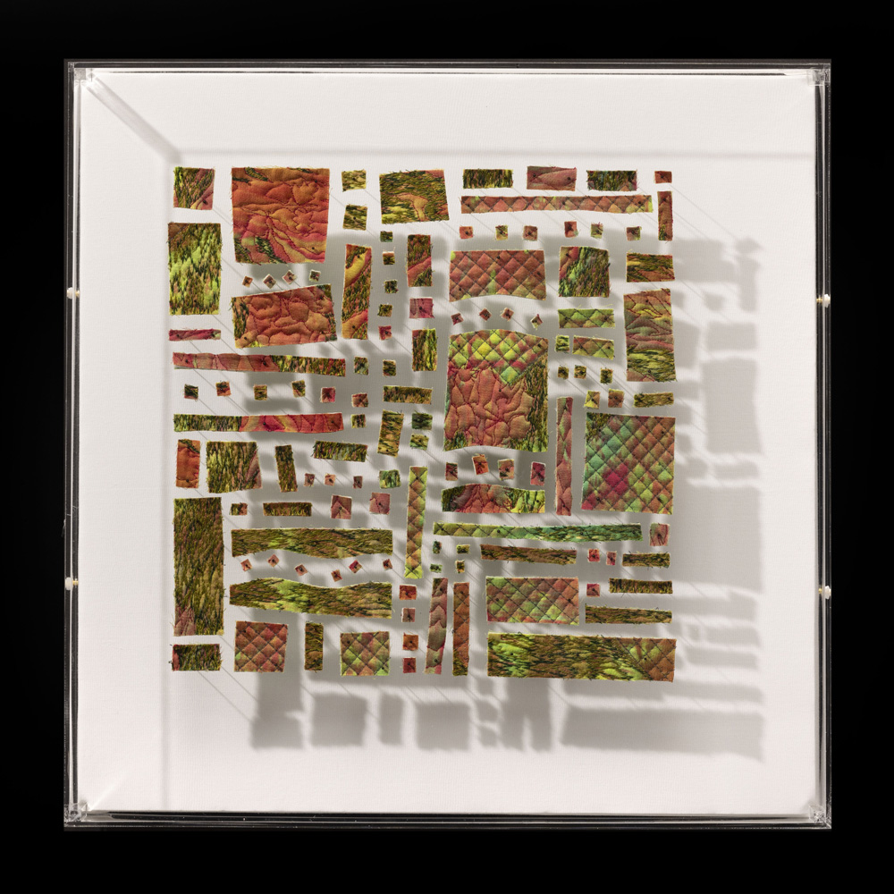 I cut a 12″ quilt into four pieces, then progressively smaller pieces, arranging and rearranging on a board, off and on for months like a puzzle with many solutions. Looking for a way to keep the transparency and create shadows, I mounted them on pins above the white ground with space to view their shadows.