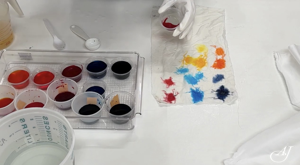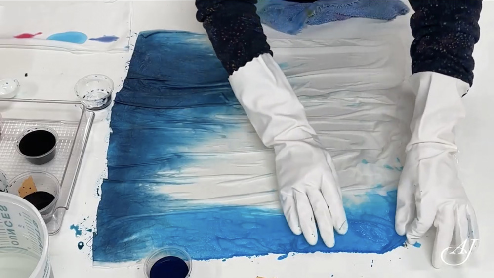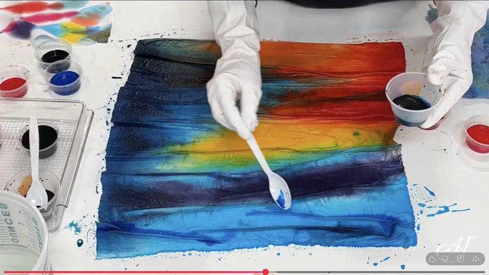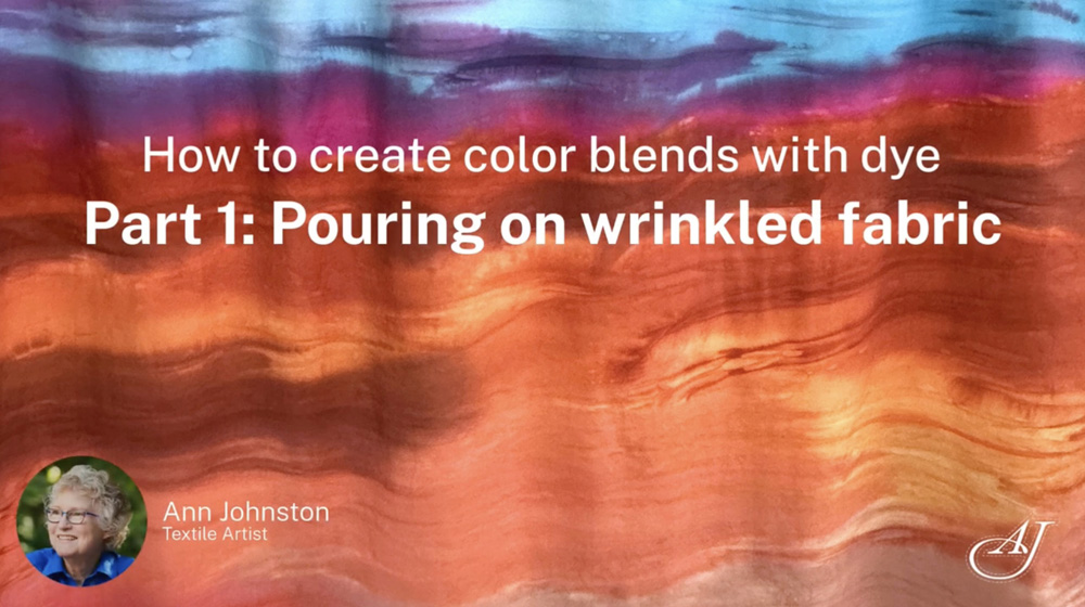 In Part 1 of this series, I’ll show you a quick approach to color blending with amazing results. At the same time I’ll review the most important facts about being sure the dye is fixed in the fabric. We are using a liquid mix and pouring it directly onto wrinkled fabric that already has the soda ash, (the fixative) on it. You can determine how the colors flow on the fabric by how much you move the wrinkles and spread the colors with your gloves.
